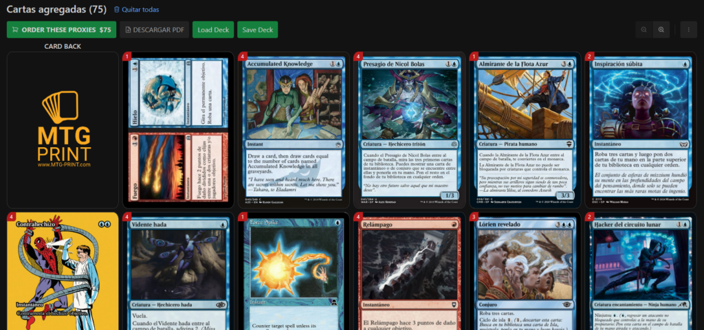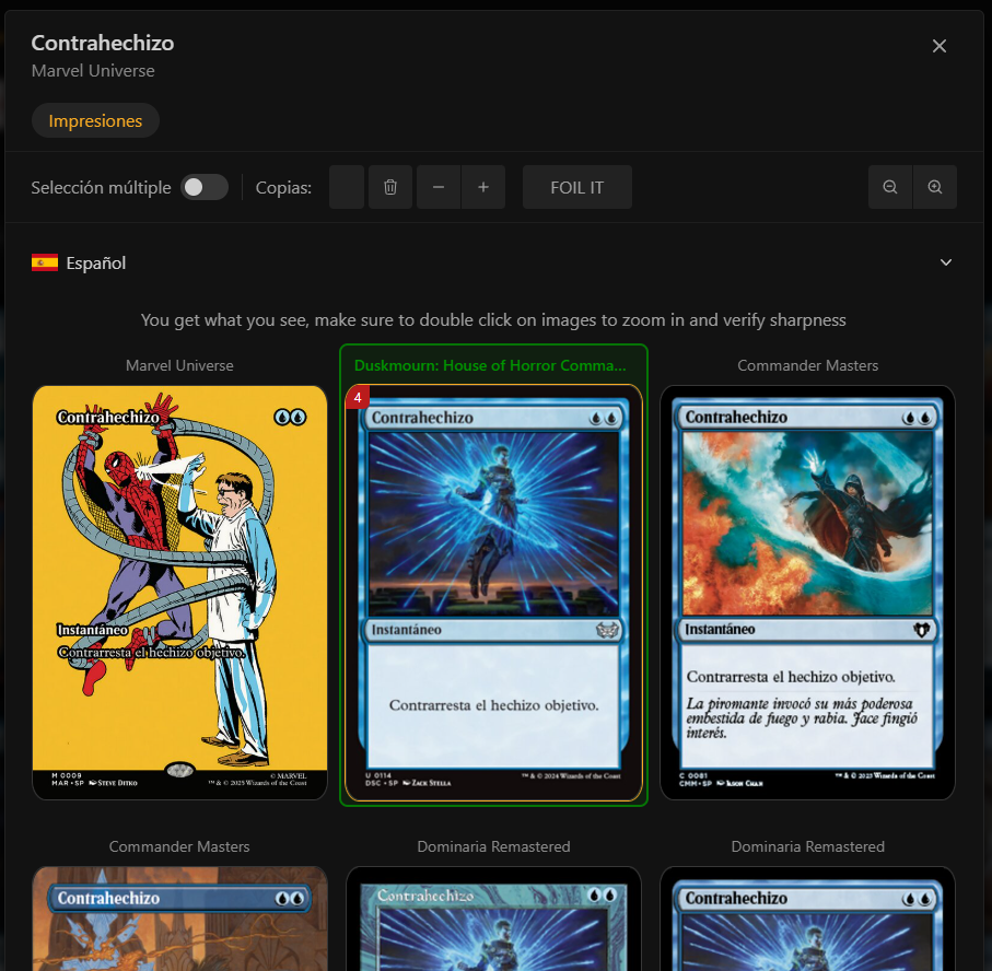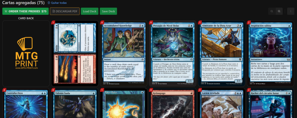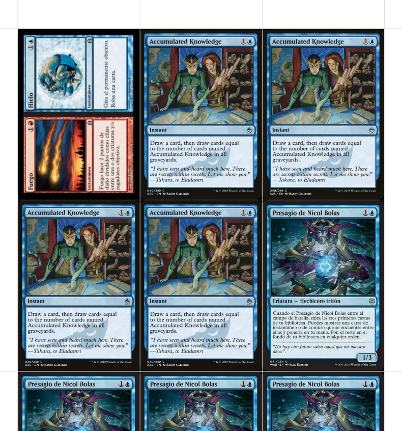 Aquí podemos hacer click en cada carta para elegir la versión que mas nos guste. También se puede ver que las cartas que no ha encontrado en español nos las ha puesto en inglés, como por ejemplo el Accumulated Knoledge o el Force Spike. Esto suele pasar con las cartas más antiguas.