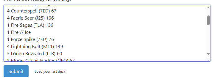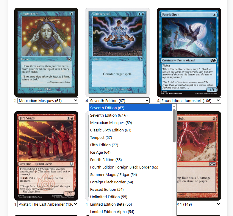 Luego podemos elegir la versión de cada carta que queremos. Al revisar me he dado cuenta que en vez del Fire/Ice que tenía en la lista me ha metido unos Fire Sages. A veces con las cartas de doble cara se lía y para solucionarlo tenemos que escribirlas de la siguiente forma: “Fire // Ice”. Con 2 “/” y separado con espacios.