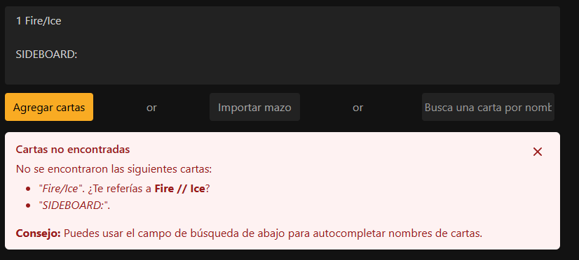 En esta página ya nos avisa de que no ha encontrado la carta doble. Podemos corregir el error y volver a darle a “Agregar cartas”. Puedes ignorar que no encuentre “SIDEBOARD:”.