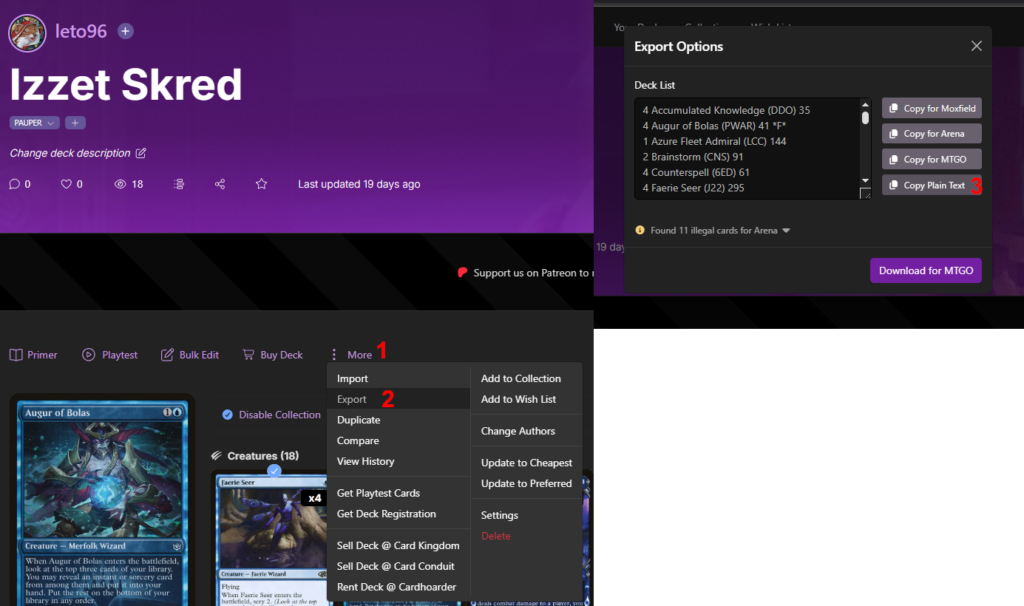 Lo primero es conseguir la lista de cartas. Si utilizas moxfield es muy sencillo. Primero abre el menú desplegable “More”, después le das a “Export” y por último en la ventana que se abre le das a “Copy Plain Text”.